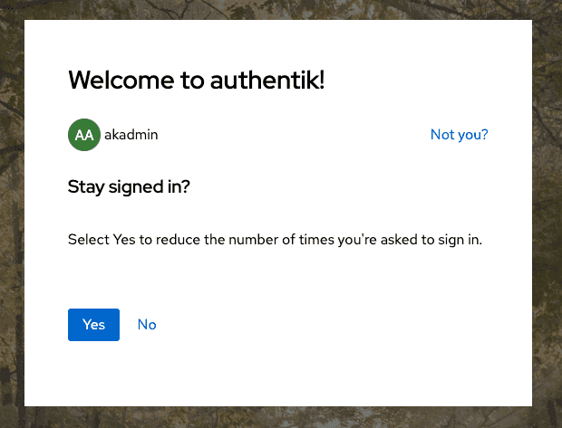 When the value in Stay signed in offset is set to a higher value than the default seconds=0, the user logging in is shown a prompt, allowing the user to choose if their session should be extended or not. The same syntax as for Session duration applies.