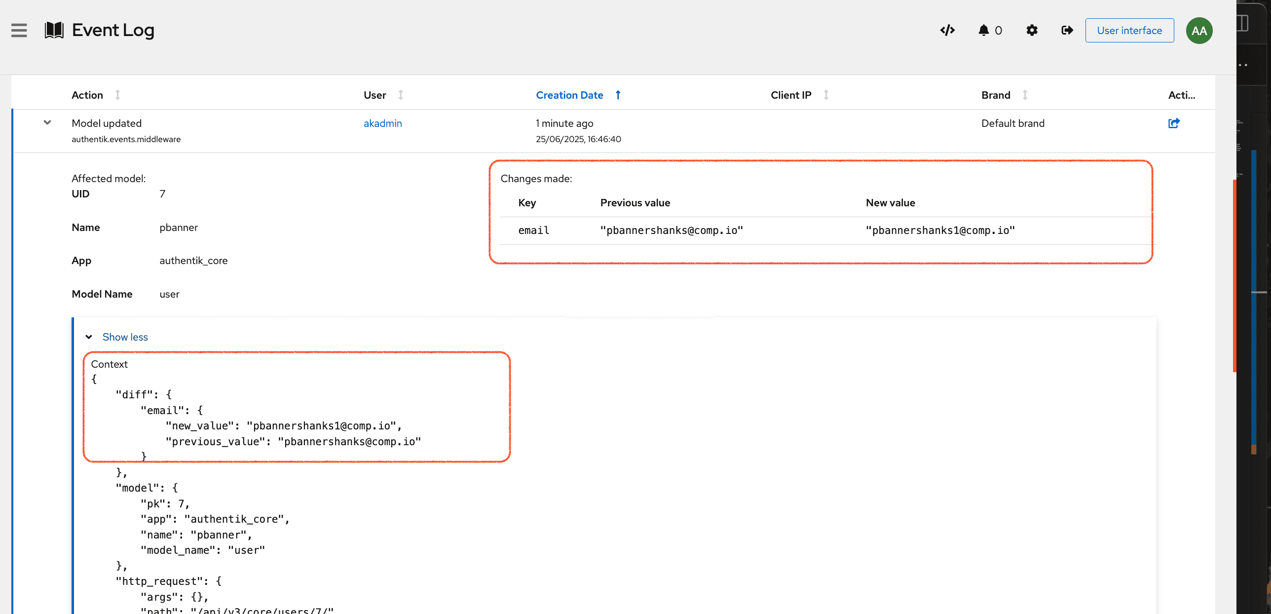 • for any event that involves the creation or modification of an object, the corresponding code differences are displayed, allowing for comparison of the previous and new configuration settings or values. For example, if an authentik administrator updates a user's email address, both the old and new email addresses are displayed in the event's detailed view. (In the open source version, event details only show that a change was made and which application and model was involved.)
